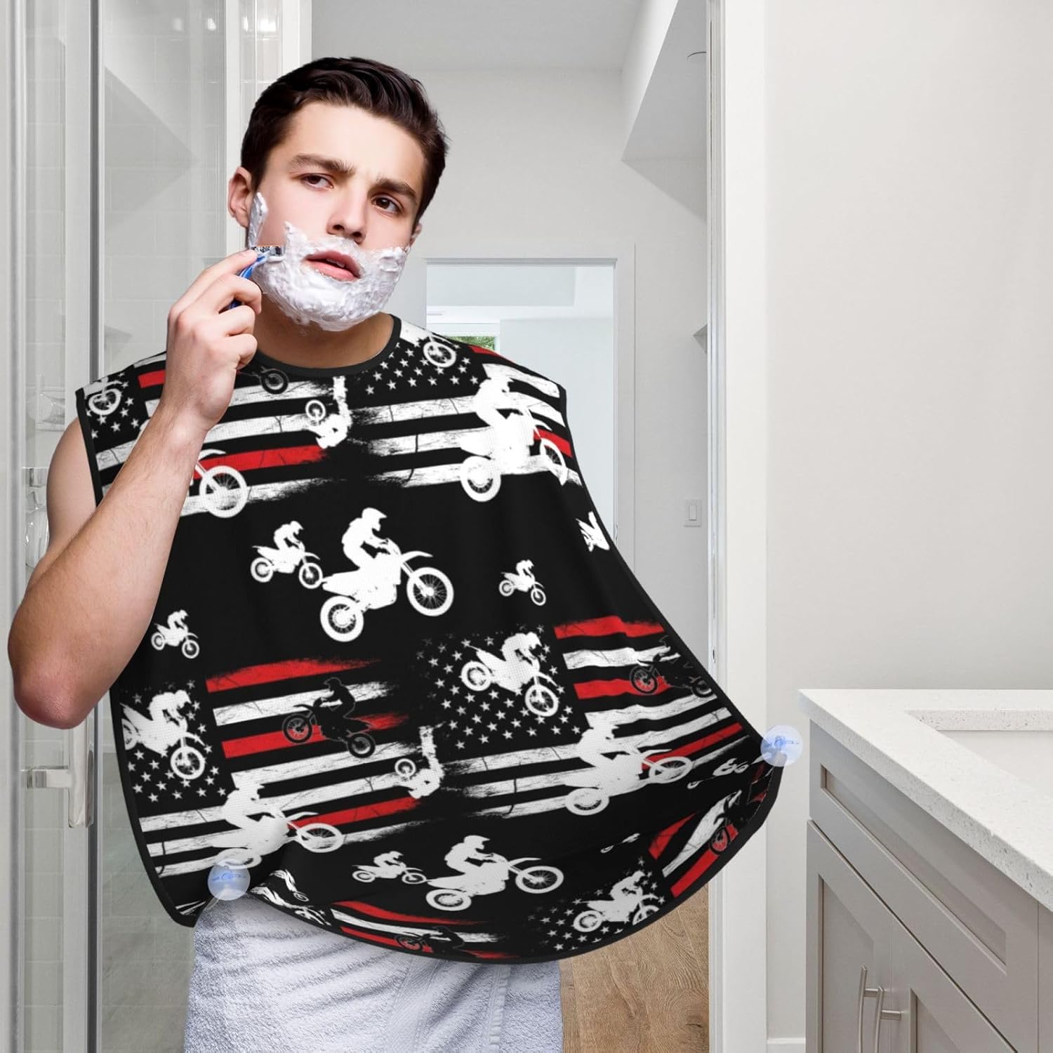 Beard Bib Apron for Men Shaving, Waterproof Non-Stick Hair Catcher with Suction Cups, Grooming Essential for Dad Husband, Motorcycle Dirt Bike Thin Red Line American Flag Black Shave Bib