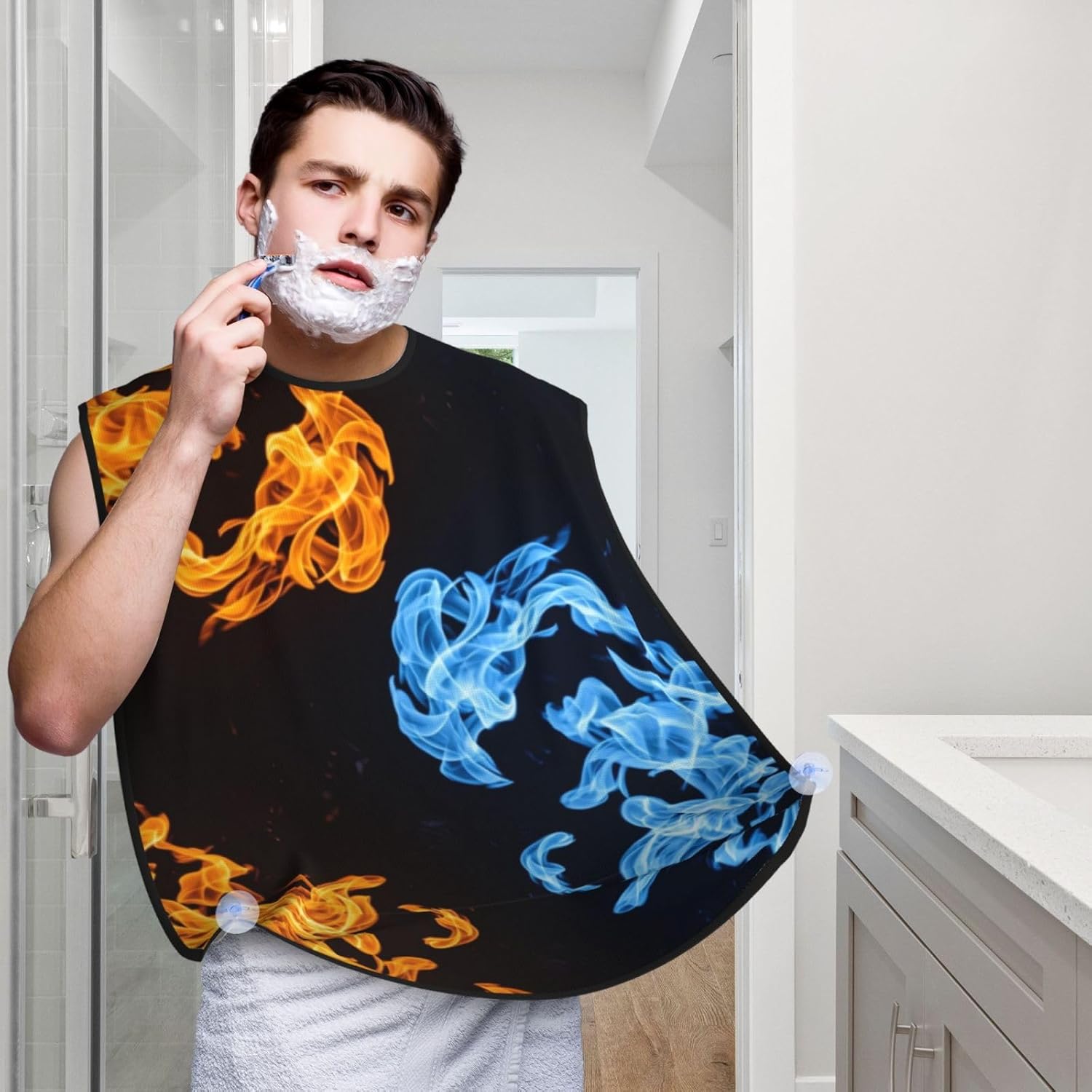 Waterproof Beard Grooming Bib, Red Blue Fire Balck Shave Bib, Non-Stick Hair Catcher for Shaving Trimming, Apron Essential for Men Dad