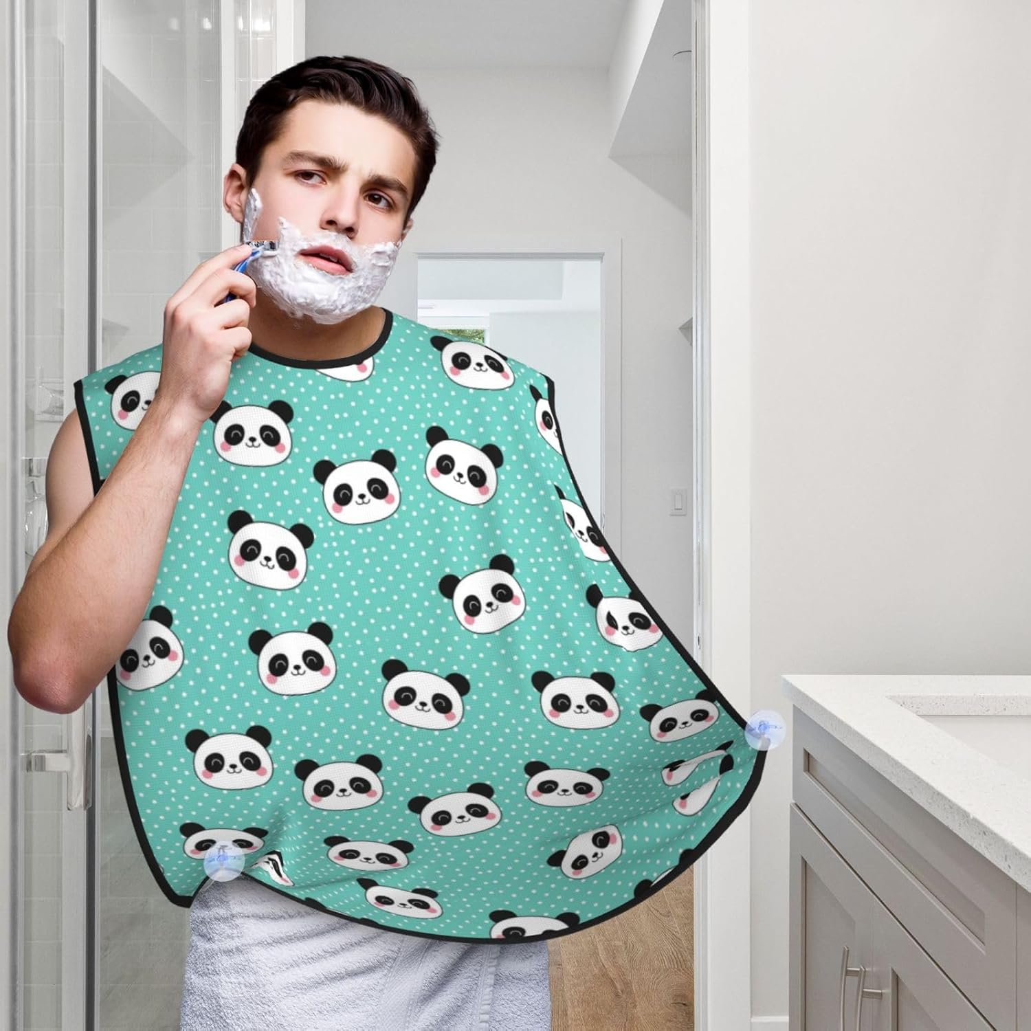 Beard Shaving Cape with Suction Cups, Kawaii Panda Face Polka Dot Teal Mint Green Shave Bib, Non-Stick Waterproof Hair Catcher, Grooming Bib for Men Husband
