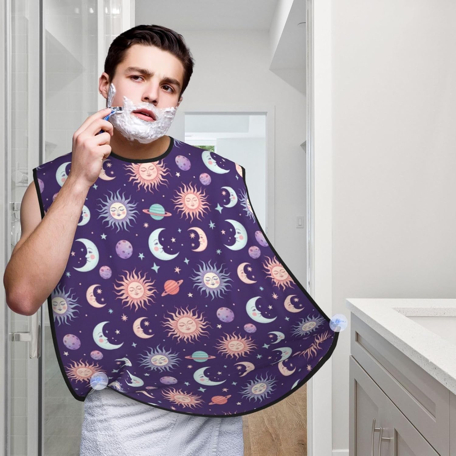 Beard Bib with 3 Suction Cups, Non-Stick Waterproof Hair Catcher Apron, Men's Shaving Essential for Grooming, Purple Galaxy Night Star Sky Trippy Sun and Moon Shave Bib