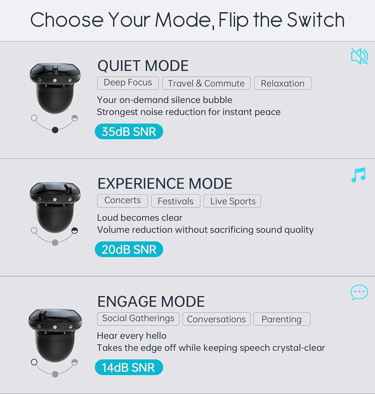 - 【3-MODE NOISE CONTROL】:Ear plugs for sleeping change between 35dB (Quite mode),20dB (Experience mode) and 14dB (Engage mode),three modes with a twistable dial, tailoring your audio experience to any environment.Seamlessly transition between three optimized modes: Travel & Rest for deep quite, Office & Focus for clear communication, and Live Experience for enhanced ambient sound immersion