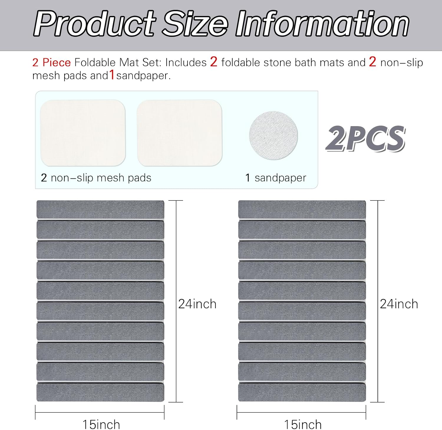 - 2-Piece Foldable Mat Set: This set includes 2 foldable diatomite bath mats, 2 non-slip mesh pads and 1 Sandpaper. Designed to deliver comprehensive floor protection in bathrooms, kitchens, laundry rooms, and entryways