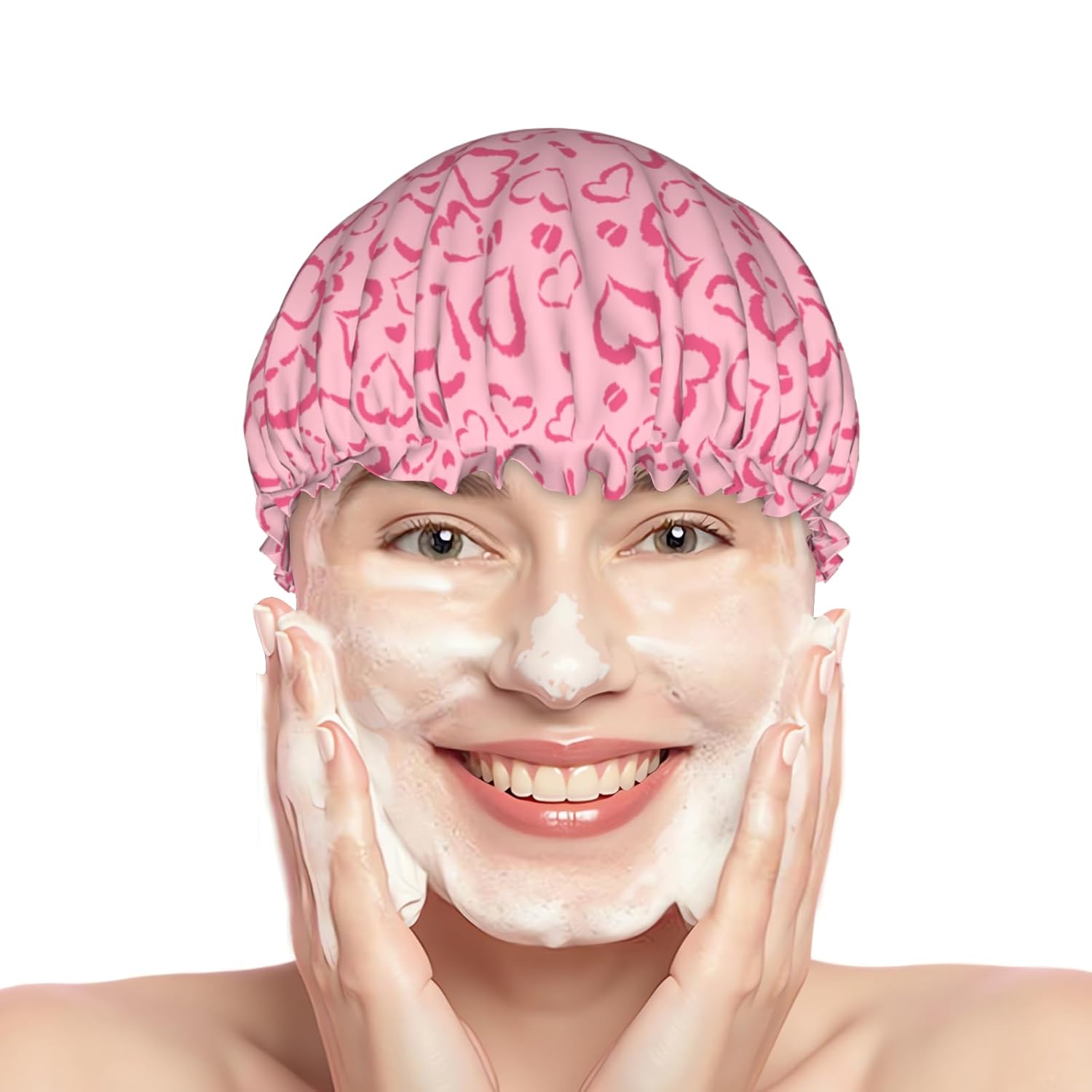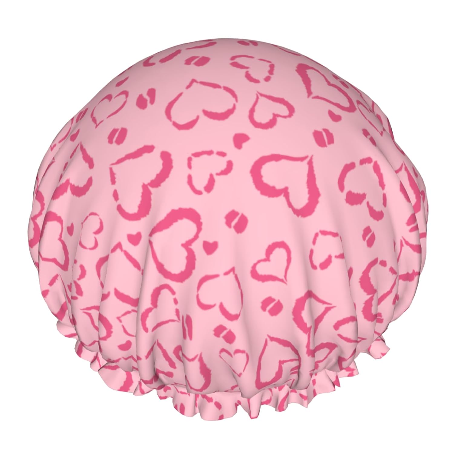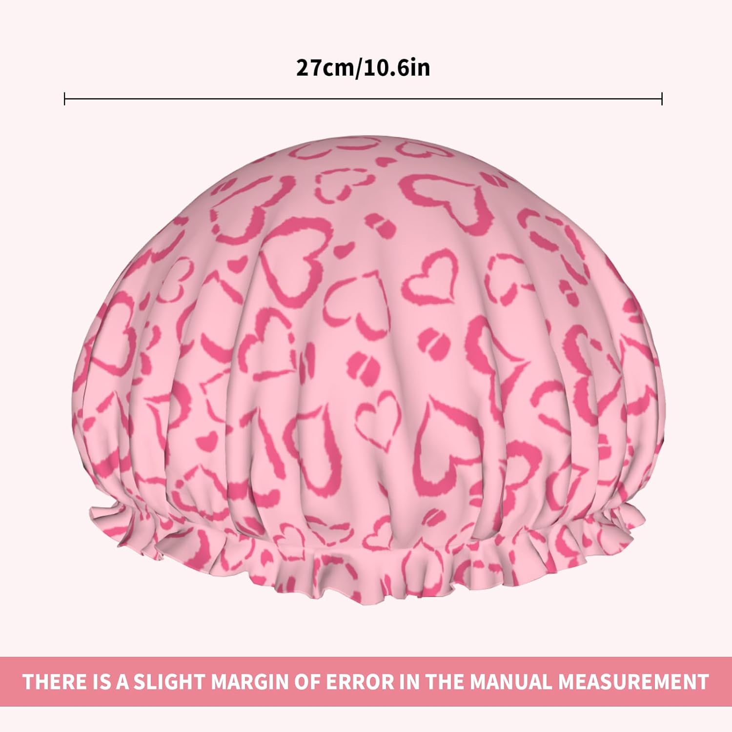 Leopard Print Reusable Shower Caps Pink Heart Dual-Layer Waterproof Bath Hat Hair Caps Elastic Hair Hat for Shower Cooking Clean Makeup Travel
