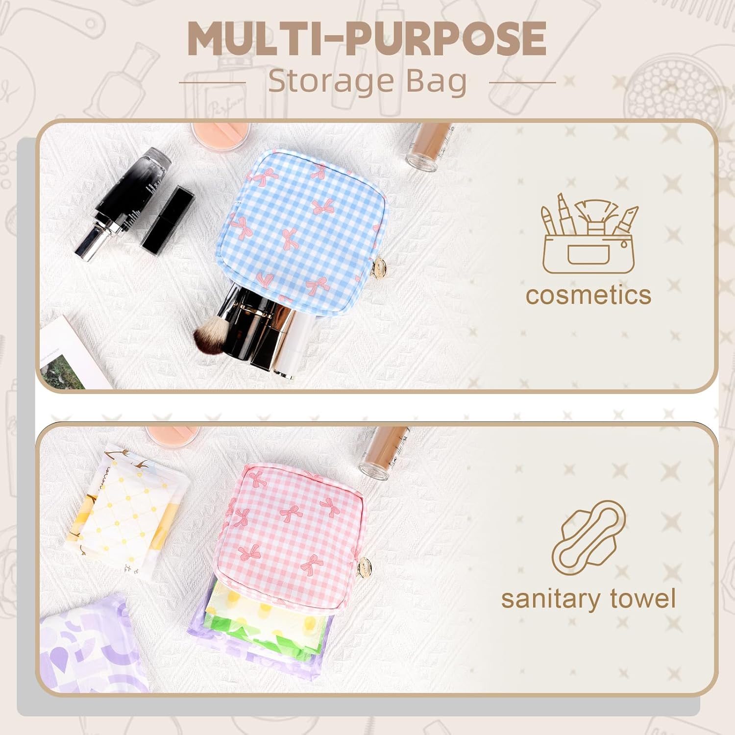 - 【Perfect Storage Pouch】Measuring: 5.6*5.5*1.7 inches. Bow tie sanitary napkin pouch can holds up to 10 normal size sanitary napkins and 4 tampons simultaneously. Whether you are at office, outdoors or traveling, the sanitary pad pouch can easily fit in your bag
