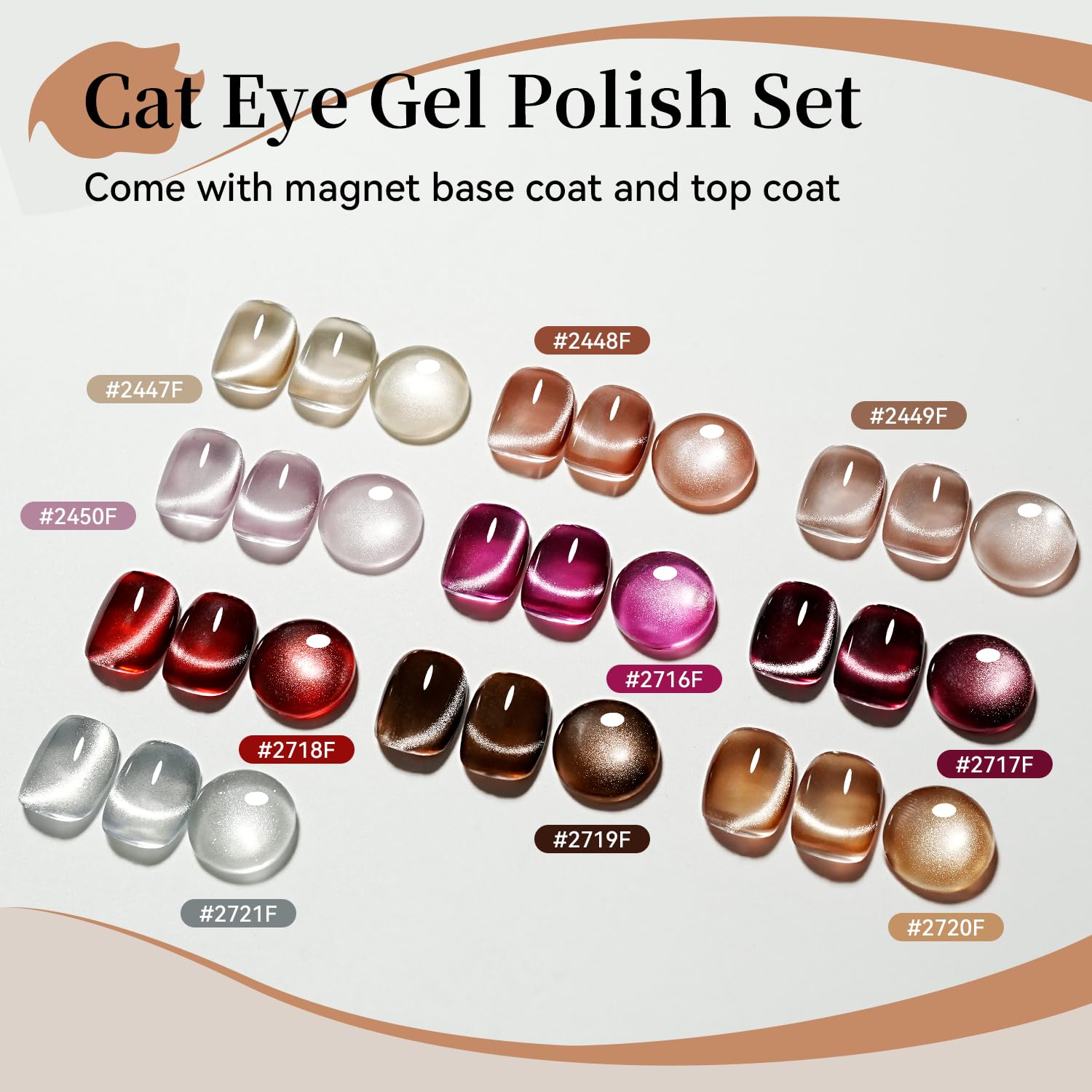 - You will Receive: 10 bottles of cat eye gel nail polish, 1 bottle of base coat, 1 bottle of top coat, and 1 magnet. Enjoy the fun of a nail salon at home.