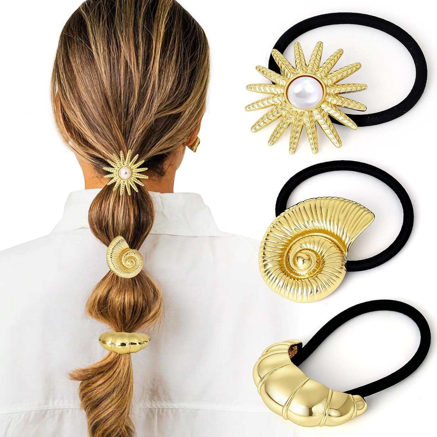 3PCS Gold Hair Ties, Metal Hair Ties for Thick Hair, Gold Ponytail Cuff Elegant Durable Geometric Design, Hair Accessories for Women, Stretchy & Non Damage Ponytail Holders with Pendant Holiday Gifts