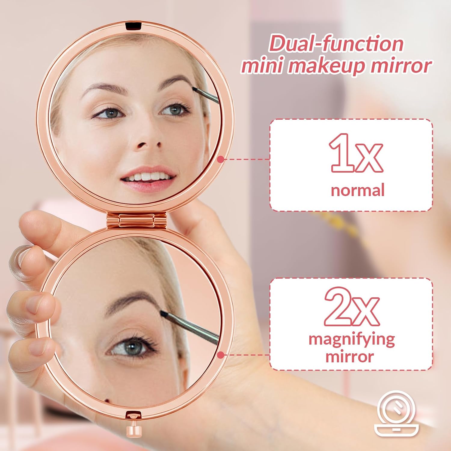 - 【1x & 2x Double-Sided Mirrors】Small purse mirrors for women feature 1X regular view and 2X magnification for precise makeup. Ideal for applying eyeliner, mascara, lipstick, or tweezing, making it an essential travel beauty tool.