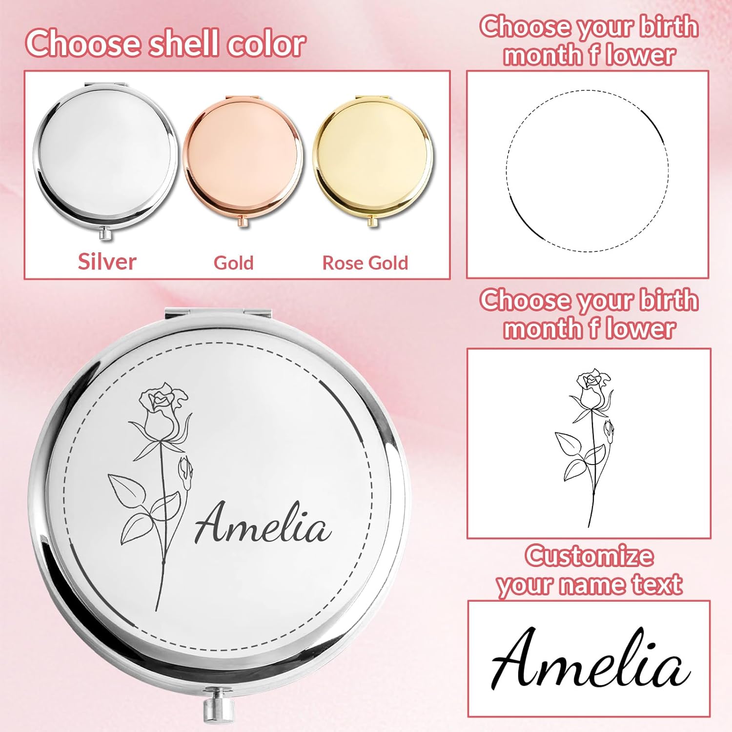 Personalized Compact Mirror – Custom Pocket Mirror with Name, Monogram Travel Purse Mirror for Women, Bridal Shower Favors & Bridesmaid Gifts, Portable Makeup Accessory (Birthday Flowers)