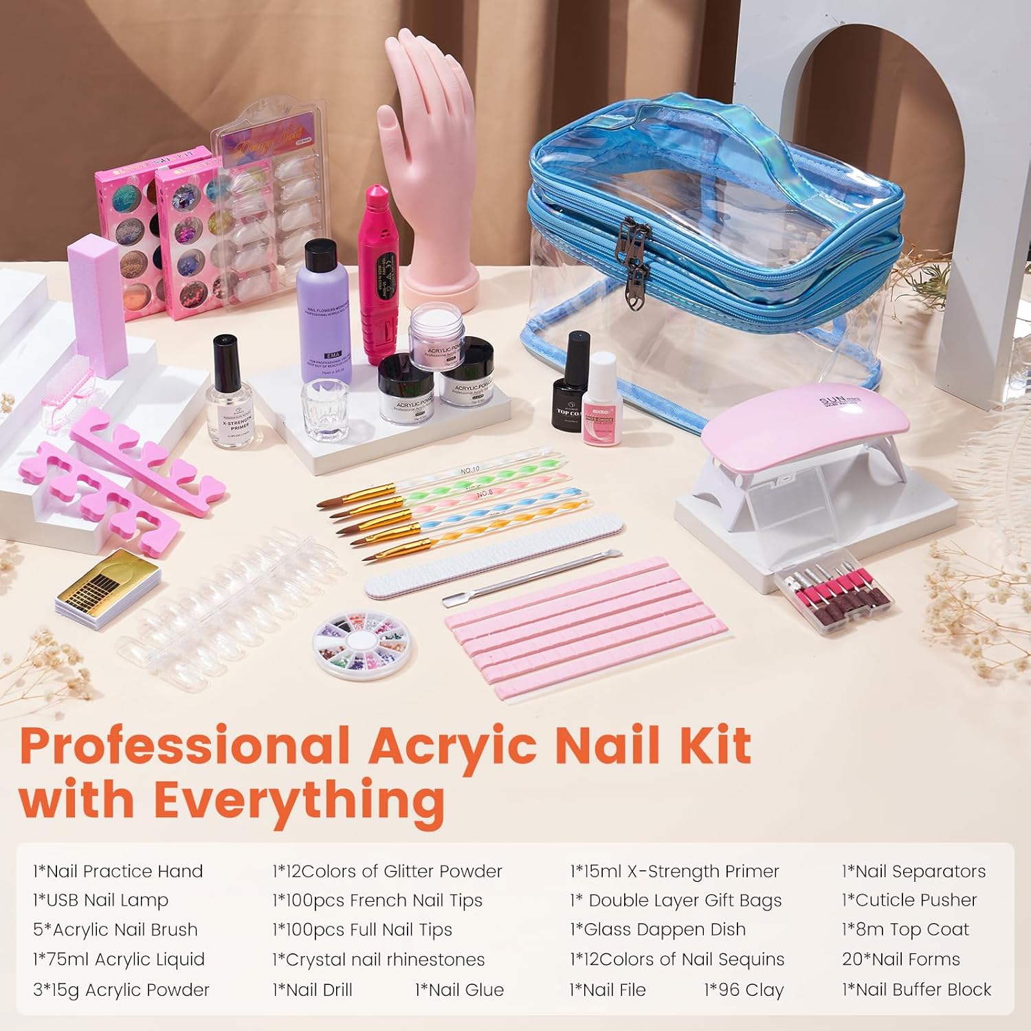 Nail Kit for Beginners with Everything: Practice Nail Hand Acrylic Nail Powder Liquid Set with U V Lamp Drill in Gift Bag for Home Salon(Blue Bag)