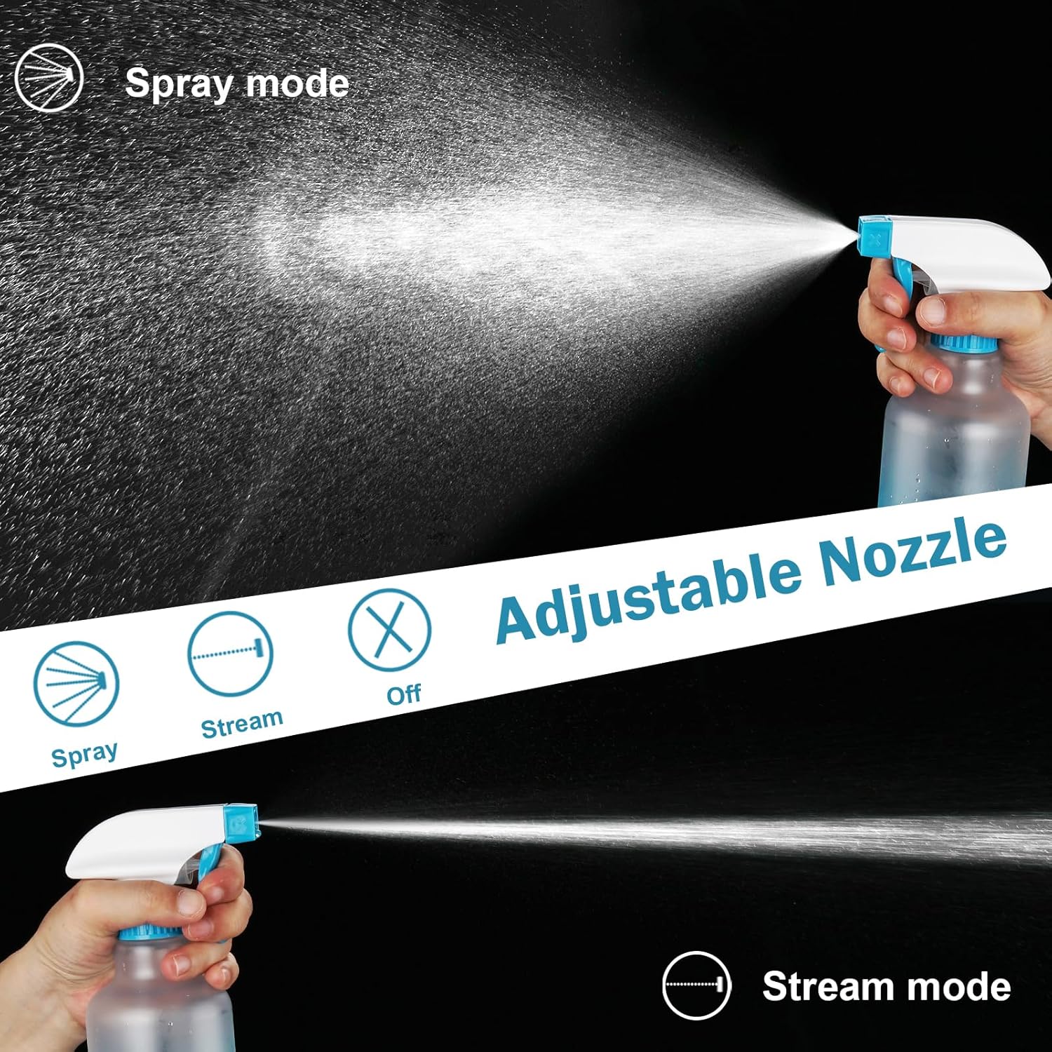 - ADJUSTABLE NOZZLE SPRAY BOTTLE: With 3 way adjustments. Easily switch between a fine mist (perfect for hairstyling or delicate plants) and a solid stream (for heavy-duty cleaning). The extended suction tube ensures every drop is used, making it a versatile water spray bottle for multiple needs.