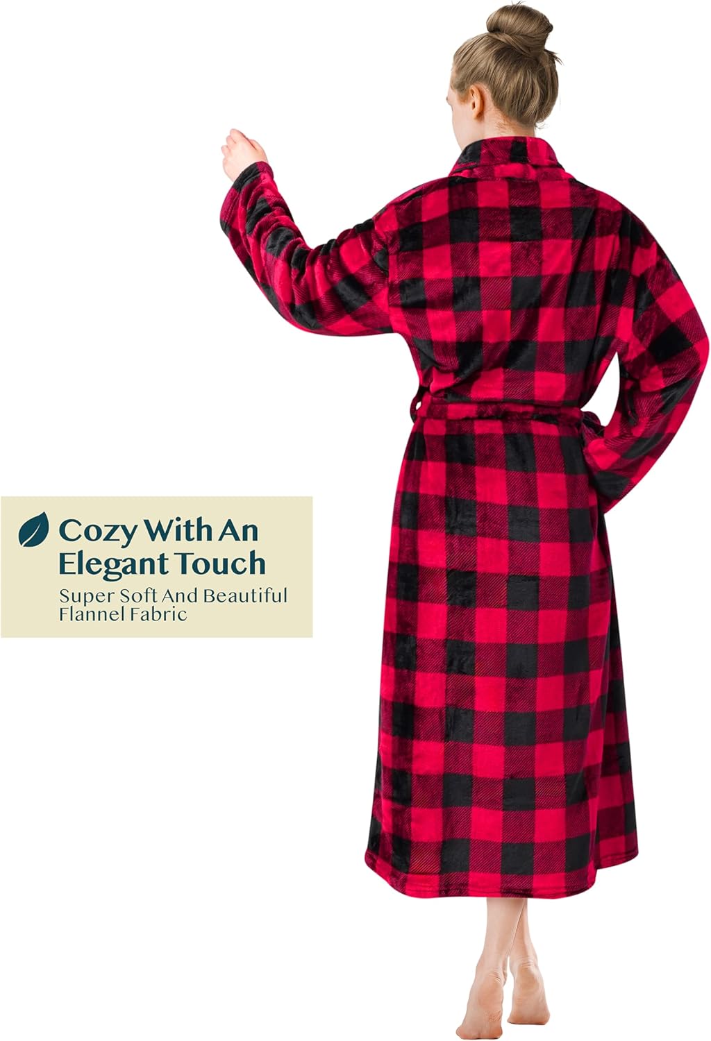 - WOMENS PLAID RED FLEECE ROBES: PAVILIA luxurious fleece robe for women is super soft, plush, fluffy and lightweight and you will never want to take it off. Its delicate microfiber construction ensures a velvety touch that will caress your skin with every wear. Features 2 large side pockets for keeping hands warm and storing remotes, glasses, keys, the long robe boasts the perfect fit and comes with a waist strap for easily adjusting to find your ideal comfort level.