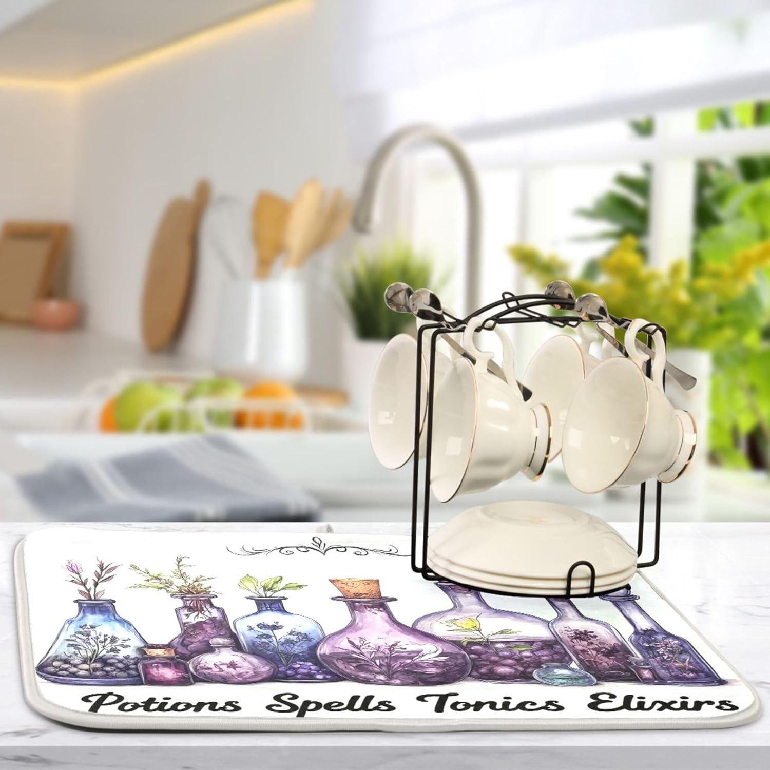 Halloween Potions Dish Drying Mat for Kitchen Countertop 18x24 Witch Herbs Purple Spooky Large Drying Mat Reusable Quick Dry Dish Sink Mats Easy Clean Decorative Essentials