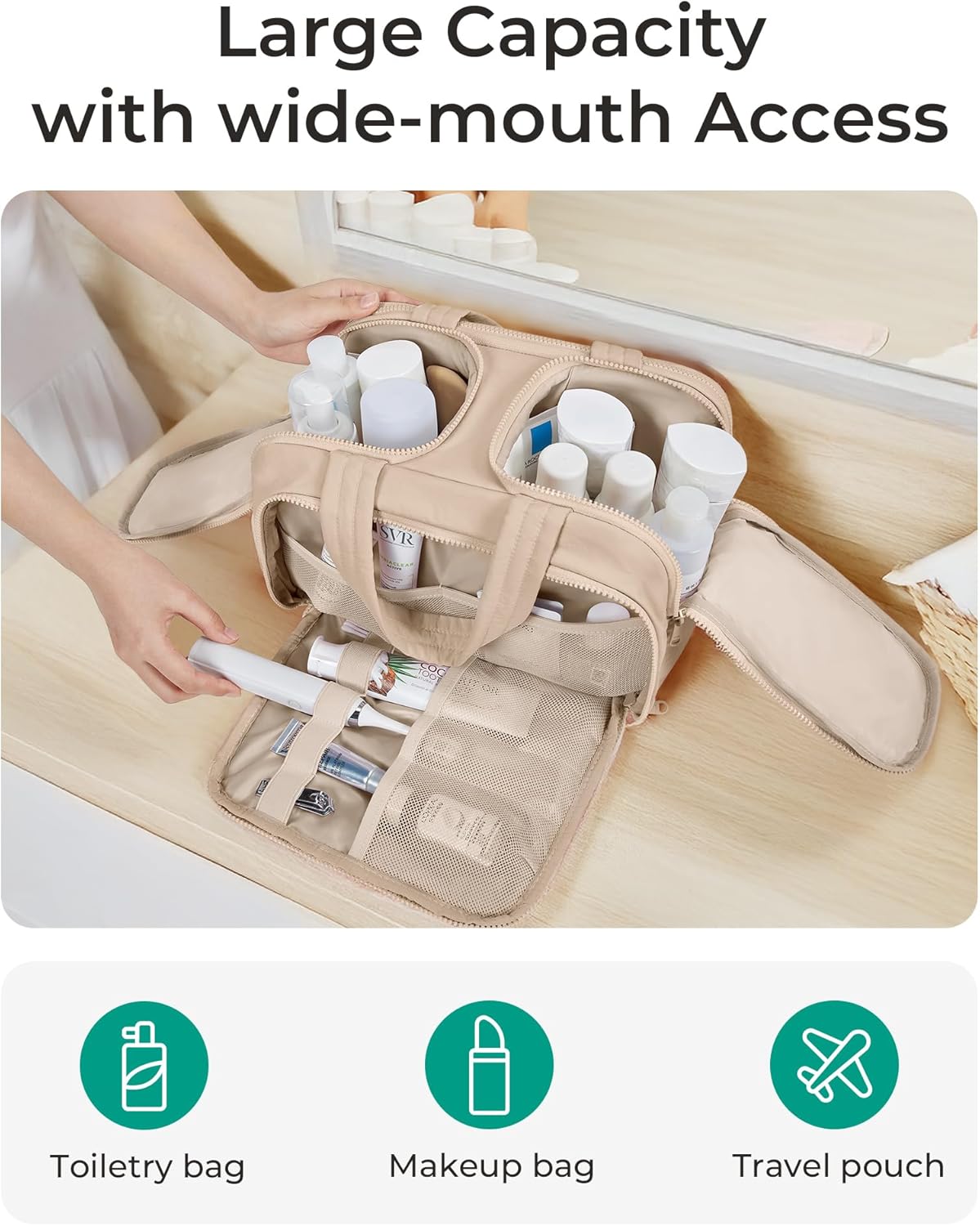 - Easy Access and Keep Upright : Full opening and not piling up for easy access to items. Double side full open design of travel bag for toiletries keeps cosmetic bottles and toiletries can stand upright in the middle compartment. Avoid leakage during transit