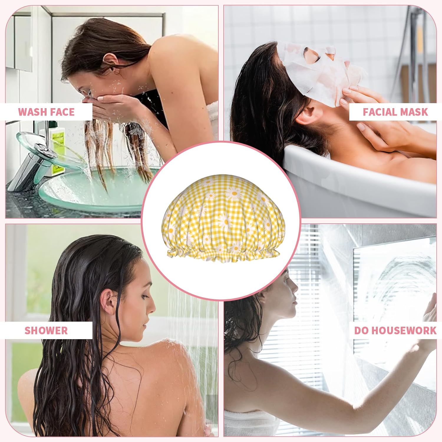 Daisy Shower Caps Yellow Checkered Dual-Layer Waterproof Bath Hat Flower Reusable Hair Caps Elastic Hair Hat for Shower Cooking Clean Makeup Travel