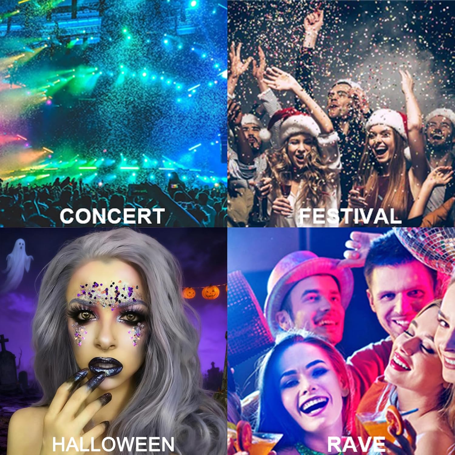 - 【Multiple Uses】Use the glitter gel for under eye tears, cheekbone highlights, glitter braids, glitter roots, collarbones, shoulders, etc. It fits for most skin types, especially suitable for Halloween, Christmas, Mardi Gras, St Patrick’s Day, as face jewels and rave accessories for singer concerts, music festival, Coachella, wedding, club, party, nightclub revelry, performance, also can be applied sparingly for daily glitter.
