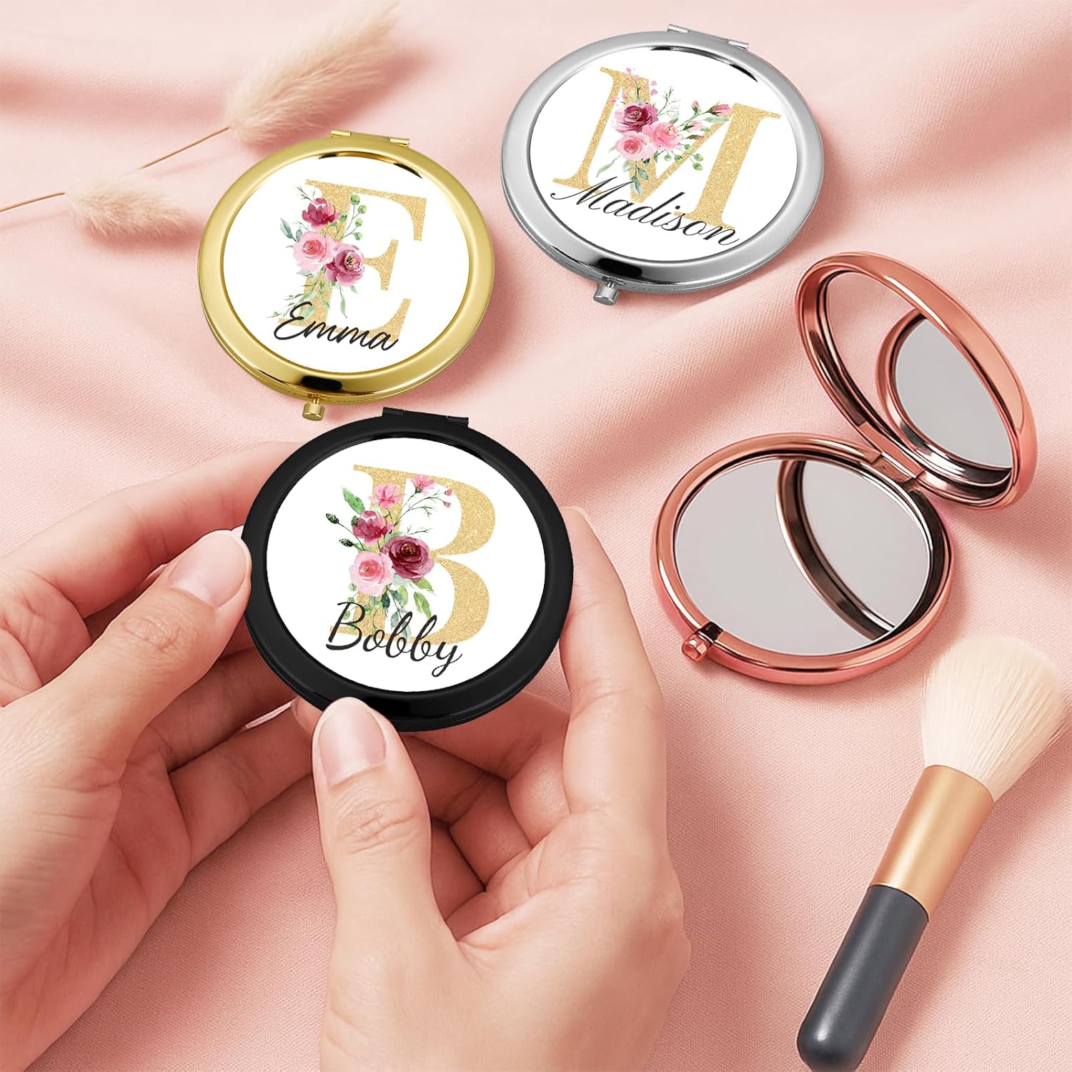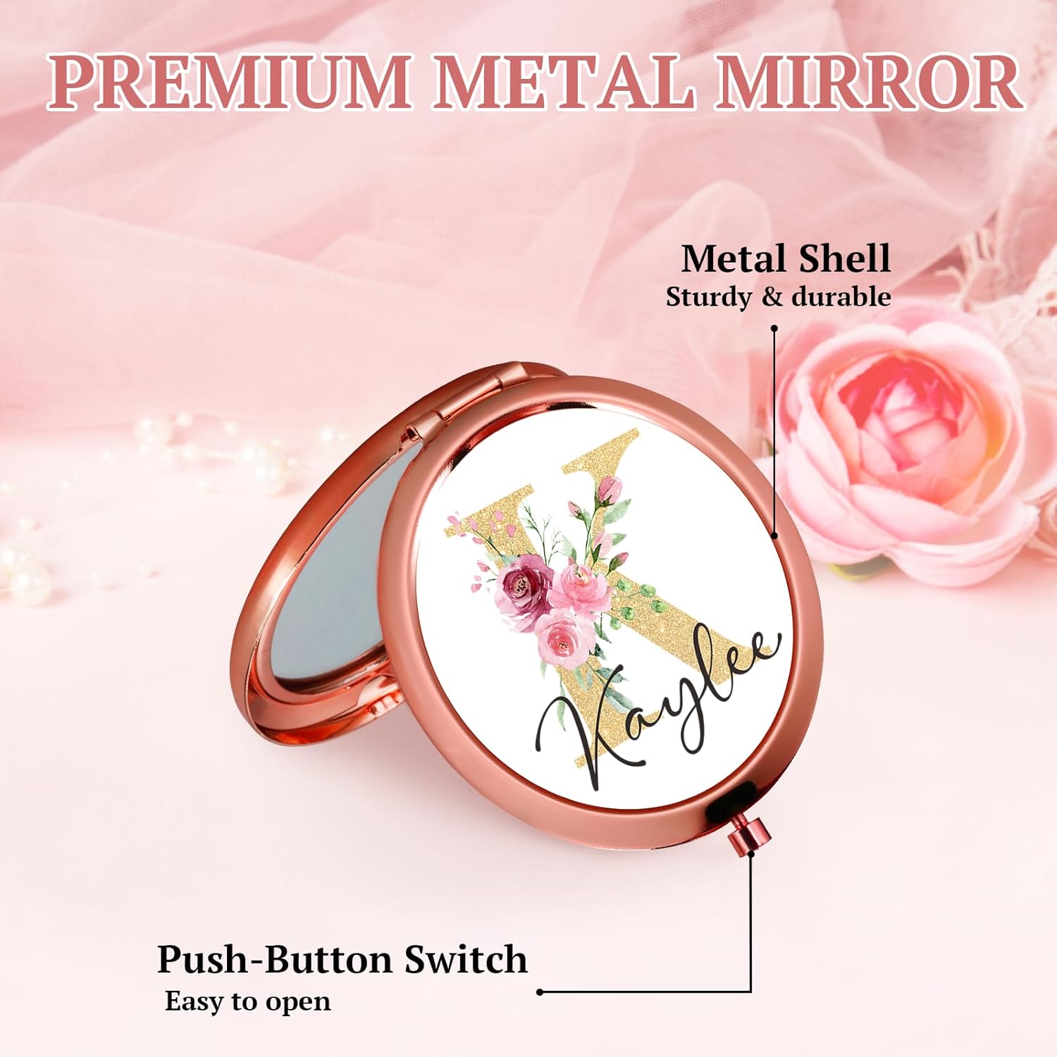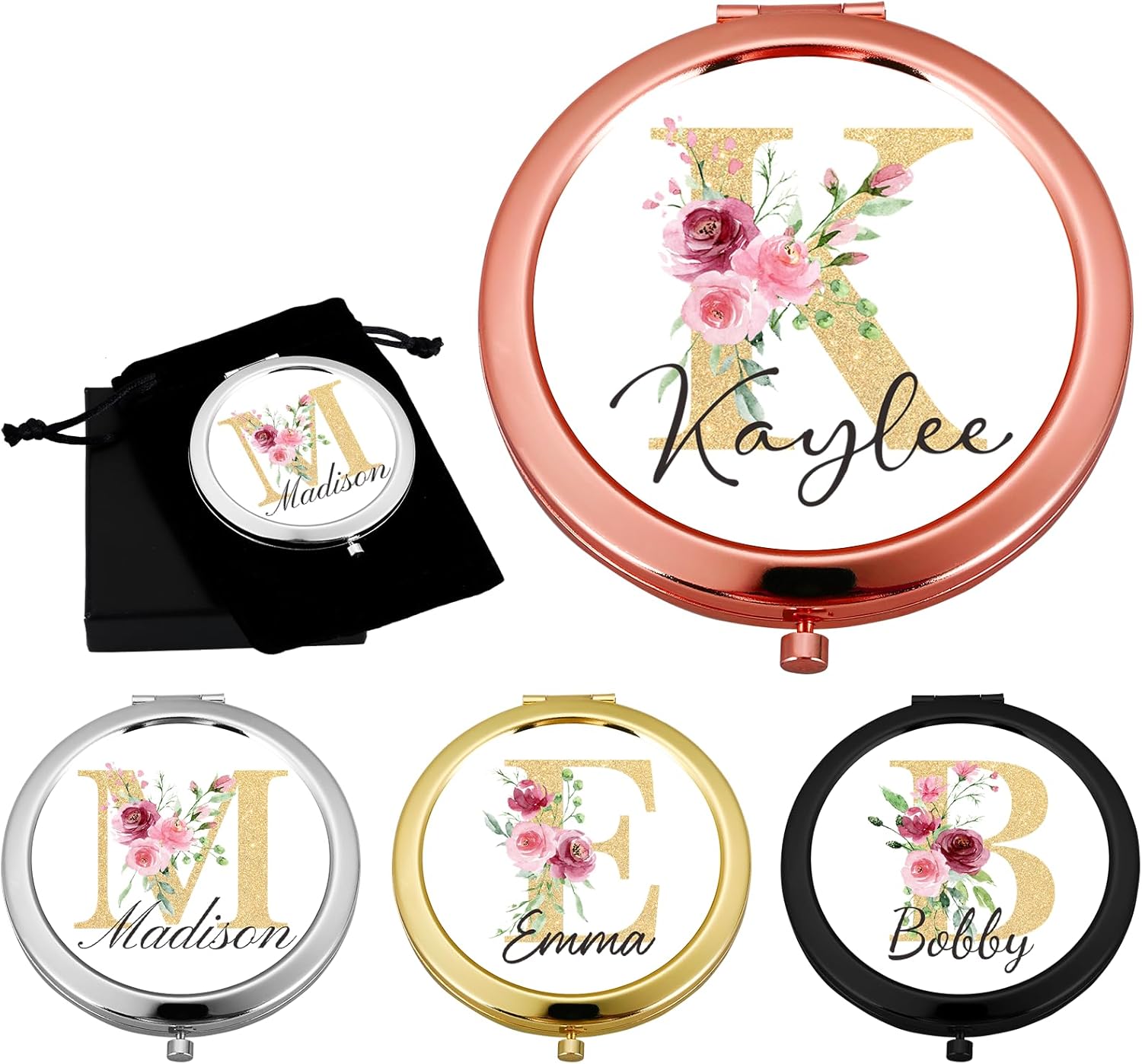 - 【Personalized Compact Mirror】This custom mini compact mirror with floral monogram letter and a name that makes the small travel mirror truly special. Perfect gifts for women who love personalized and stylish accessories. Whether it’s for yourself, your Mom, daughter, teen girls, college girls, wife, girlfriend, sister, best friend, bridesmaid, colleague, or teacher, this custom compact mirror with initial and name is an ideal gift. Just click the "Customize Now" button to create your own mirror.